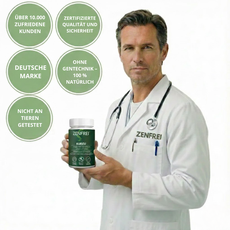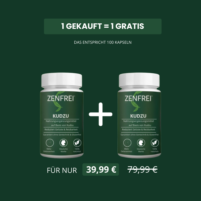 Durch diese Regulierung hilft Zenfrei, die Intensität und Häufigkeit von Verlangen nach Alkohol, Tabak oder Zucker deutlich zu reduzieren – ohne Frustration zu erzeugen. Zusätzlich besitzt Kudzu beruhigende und entspannende Eigenschaften, die Stress, Reizbarkeit und Angstzustände lindern können, welche häufig während Entzugsphasen auftreten.